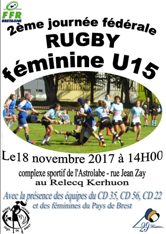 La deuxième journée fédérale de rugby féminin U15 aura lieu le samedi 18 novembre 2017 au complexe sportif de Kerzincuff, rue Jean Zay, au Relecq Kerhuon à partir de 14 heures.