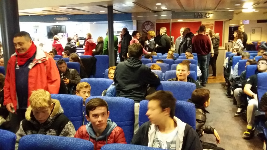 Le temps d'une bonne douche, de se restaurer dans le club house et d'échanger cadeaux et remerciements chaleureux avec nos hôtes et c'est déjà l'heure de regagner l'hôtel pour récupérer les bagages et rejoindre à pieds, la gare maritime. Les cartes d'identité et les cartes d'embarquement sont redistribuées pour enregistrer les valises. Il faut patienter 1 bonne heure avant de commencer à embarquer. Vérification après 30 mn de repos sur les banquettes de la gare : tout le monde a bien sa carte d'identité ? 2 garçons fouillent leurs poches avec inquiétude : le premier réalise qu'il a laissé sa carte dans son sac de voyage... et il faudra se précipiter au guichet pour demander au personnel d'intercepter les charriots de bagages pour récupérer le précieux laisser-passer. Quand à son camarade, la carte a glissé dans une doublure de son blouson...dernier coup de stress avant un retour paisible en terre bretonne. Nous retrouvons Guillaume et sa tata, à l'arrivée à St Malo...le car nous attend, en route vers le Finistère.