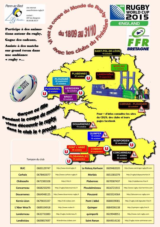 Pendant la coupe du monde de rugby, de nombreuses animations ouvertes à tous, destinées plus particulièrement aux jeunes, garçons et filles, sont programmées dans le Finistère entre le 26 septembre et le 31 octobre, à l'initiative des clubs ou du Comité départemental. La caravane du Tro Breizh sera présente sur 15 sites : Plouzané, Trégourez, Plobannalec, Rosporden, Combrit, Plabennec, Concarneau, Plouarzel, Kéredern, Brest, Trégunc, Carhaix, Quimper, Morlaix, Pont L'abbé. Les clubs sont invités à actionner leurs réseaux (écoles et collèges du secteur), contacter la presse, distribuer des flyers, inciter les joueurs de l'école de rugby à amener copains ou copines pour participer aux animations : structures ludiques, scrum machines, initiation au jeu à toucher, parcours techniques, quizz coupe du monde...Les participants non licenciés devront souscrire un pass rugby. Système U est partenaire de l'opération sur 7 sites du 29, la brasserie Britt est impliquée sur la manifestation de Trégunc-Concarneau. Plusieurs animations importantes sont programmées au centre ville, à Concarneau, Brest et Quimper. Dans le prolongement de la coupe du monde des tournois scolaires sont dors et déjà annoncés (Douarnenez, Plougastel...). C'est le moment ou jamais pour les clubs de se mobiliser et de se faire connaître ! La coupe du monde pour nous, ça commence dans le Finistère ! et tous derrière le XV de France !