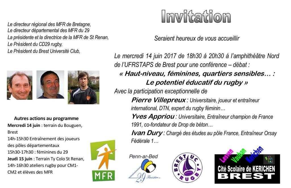 Cette conférence organisée par les MFR du Finistère, le Comité départemental de Rugby et le Brest Université Club est l’occasion de réfléchir aux conditions à mettre en œuvre pour un rugby accessible à tous les publics et réellement éducatif et émancipateur. Pierre Camou l’ancien président de la FFR rappelait souvent « le but n’est pas de former des joueurs de rugby mais des hommes »