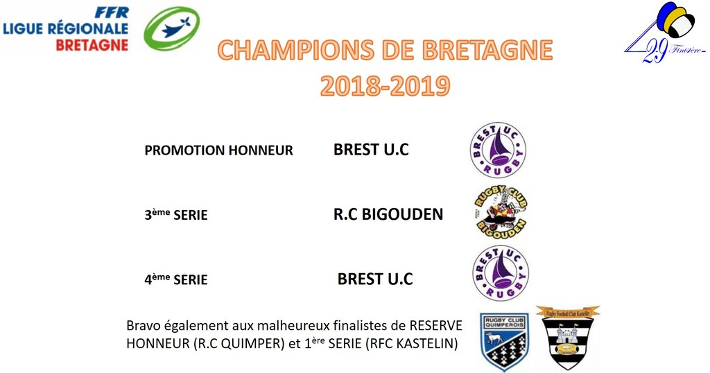 Mais la palme revient au BREST U.C qui réalise un magnifique doublé en tant que champion de Bretagne Promotion d'Honneur (victoire 32-10 face au R.C du Pays de Muzillac) et champion de Bretagne de 4ème série (victoire 31-18 face à Pontivy).